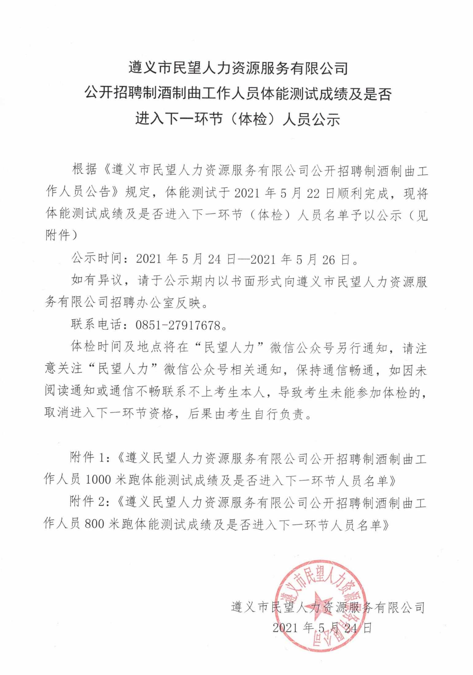 遵義市民望人力資源服務(wù)有限公司公開招聘制酒制曲工作人員體能測(cè)試成績(jī)及是否進(jìn)入下一環(huán)節(jié)(體檢)人員公示